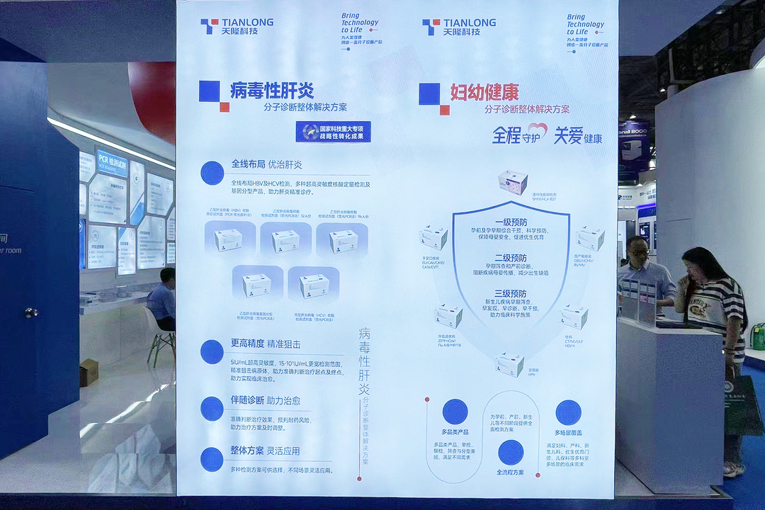 展會(huì)期間,天隆參與的國(guó)家科技重大專項(xiàng)戰(zhàn)略性轉(zhuǎn)化成果:超高敏乙肝病毒(HBV)核酸測(cè)定試劑盒,及人運(yùn)動(dòng)神經(jīng)元存活基因1(SMN1)等試劑產(chǎn)品同樣吸引了參展人員諸多目光。