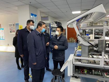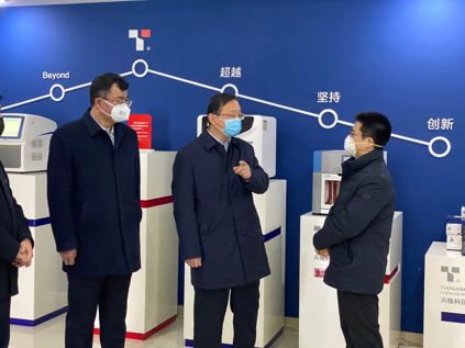 2020年2月8日,西安市市委副書記韓松在經開區區委書記玉蘇甫江·麥麥提等人的陪同下蒞臨我司調研指導疫情防控工作。在我司總經理助理梁佳明先生等人的陪同下,市委副書記韓松一行實地察看了公司的生產車間、產品展覽室等,仔細了解天隆科技目前產品研發、生產及原料采購、安全復工等工作的開展情況。