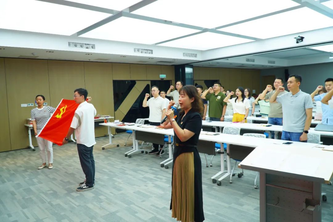 在莊重的氛圍中,袁瑩同志帶領(lǐng)全體黨員重溫入黨誓詞,鏗鏘誓言響徹會(huì)場(chǎng)。