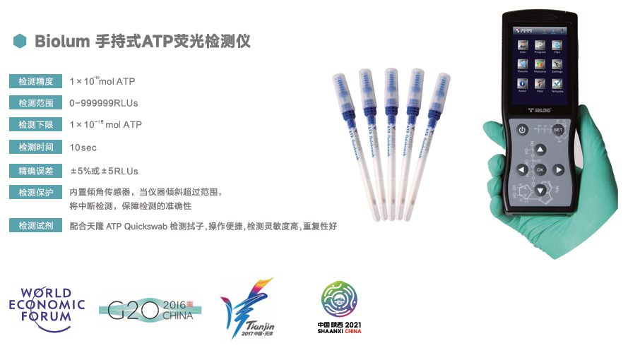 本次合作的核心產品Biolum手持式ATP熒光檢測儀,是天隆科技在食品安全和衛生監控領域的明星產品。它檢測速度快,10秒即可完成潔凈度檢測,具備靈敏度高、操作簡便、機身小巧便捷等突出特點,適用于包括食藥監抽檢、食品加工企業自檢、醫療機構、商超現場抽檢、校園食堂巡檢、大型活動用餐安全保障等的多場景檢測。該產品在國內衛生監督系統及食品企業得到廣泛應用,也曾多次為G20峰會、達沃斯論壇、全運會等重大國際活動提供食品安全保障。