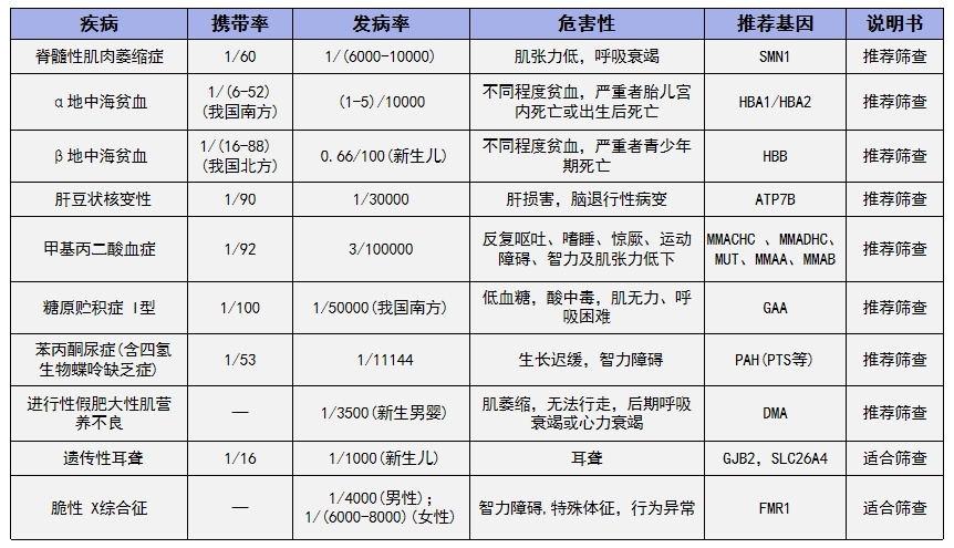 根據(jù)核心推薦意見3,共識(shí)列出了國內(nèi)幾種常見的推薦及適合納入攜帶者篩查的疾病。其中“推薦篩查”為該疾病建議納入篩查,“適合篩查”為該疾病可考慮選擇納入篩查。